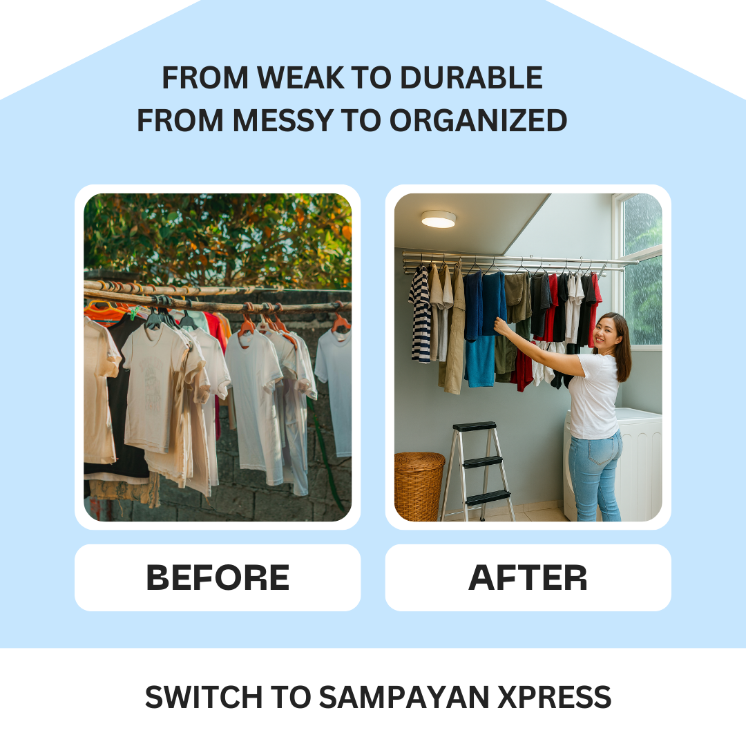 Traditional sampayan and flimsy drying racks take up too much space and fail under heavy wet laundry.